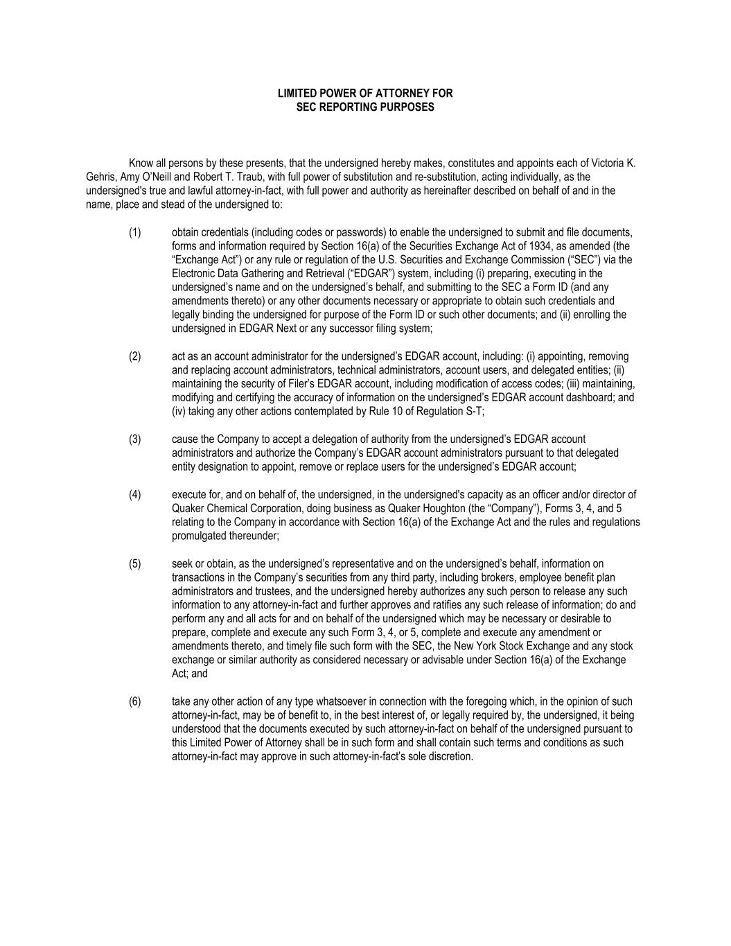 LIMITED POWER OF ATTORNEY FOR SEC REPORTING PURPOSES Know all persons by these presents, that the undersigned hereby makes, constitutes and appoints each of Victoria K. Gehris, Amy O’Neill and Robert T. Traub, with full power of substitution and re-substitution, acting individually, as the undersigned's true and lawful attorney-in-fact, with full power and authority as hereinafter described on behalf of and in the name, place and stead of the undersigned to: (1) obtain credentials (including codes or passwords) to enable the undersigned to submit and file documents, forms and information required by Section 16(a) of the Securities Exchange Act of 1934, as amended (the “Exchange Act”) or any rule or regulation of the U.S. Securities and Exchange Commission (“SEC”) via the Electronic Data Gathering and Retrieval (“EDGAR”) system, including (i) preparing, executing in the undersigned’s name and on the undersigned’s behalf, and submitting to the SEC a Form ID (and any amendments thereto) or any other documents necessary or appropriate to obtain such credentials and legally binding the undersigned for purpose of the Form ID or such other documents; and (ii) enrolling the undersigned in EDGAR Next or any successor filing system; (2) act as an account administrator for the undersigned’s EDGAR account, including: (i) appointing, removing and replacing account administrators, technical administrators, account users, and delegated entities; (ii) maintaining the security of Filer’s EDGAR account, including modification of access codes; (iii) maintaining, modifying and certifying the accuracy of information on the undersigned’s EDGAR account dashboard; and (iv) taking any other actions contemplated by Rule 10 of Regulation S-T; (3) cause the Company to accept a delegation of authority from the undersigned’s EDGAR account administrators and authorize the Company’s EDGAR account administrators pursuant to that delegated entity designation to appoint, remove or replace users for the undersigned’s EDGAR account; (4) execute for, and on behalf of, the undersigned, in the undersigned's capacity as an officer and/or director of Quaker Chemical Corporation, doing business as Quaker Houghton (the “Company”), Forms 3, 4, and 5 relating to the Company in accordance with Section 16(a) of the Exchange Act and the rules and regulations promulgated thereunder; (5) seek or obtain, as the undersigned’s representative and on the undersigned’s behalf, information on transactions in the Company’s securities from any third party, including brokers, employee benefit plan administrators and trustees, and the undersigned hereby authorizes any such person to release any such information to any attorney-in-fact and further approves and ratifies any such release of information; do and perform any and all acts for and on behalf of the undersigned which may be necessary or desirable to prepare, complete and execute any such Form 3, 4, or 5, complete and execute any amendment or amendments thereto, and timely file such form with the SEC, the New York Stock Exchange and any stock exchange or similar authority as considered necessary or advisable under Section 16(a) of the Exchange Act; and (6) take any other action of any type whatsoever in connection with the foregoing which, in the opinion of such attorney-in-fact, may be of benefit to, in the best interest of, or legally required by, the undersigned, it being understood that the documents executed by such attorney-in-fact on behalf of the undersigned pursuant to this Limited Power of Attorney shall be in such form and shall contain such terms and conditions as such attorney-in-fact may approve in such attorney-in-fact’s sole discretion.